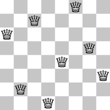Problem : Given a n x n grid, how would you place n queens so that no two are attacking. Two queens are said to be attacking if they are on same row, column or diagonal. The naive solution of this problem will require to find all the permutations i.e. finding all the n! arrangements. A typical example of n queen problem is 8 queen problem which requires us to find possible placements of 8 queens on a 8 x 8 chess board. One of the arrangements of 8 x 8 problem is shown below :